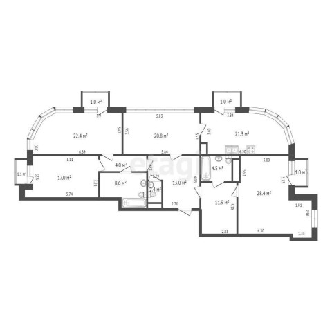 Она включает в себя кухню (21,3 кв.м.) с выходом на балкон, несколько комнат различной площади, включая просторную (28,4 кв.м.) с выходом на балкон, и три санузла.