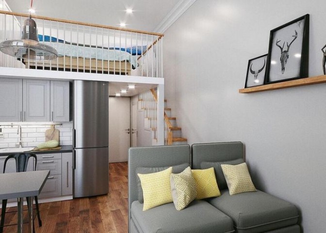 В студии высокие потолки, что позволило сделать второй ярус и устроить там чудесную спальную зону, расширив еще больше площадь квартиры. Студия очень светлая и теплая – окна выходят на Дойников переулок.