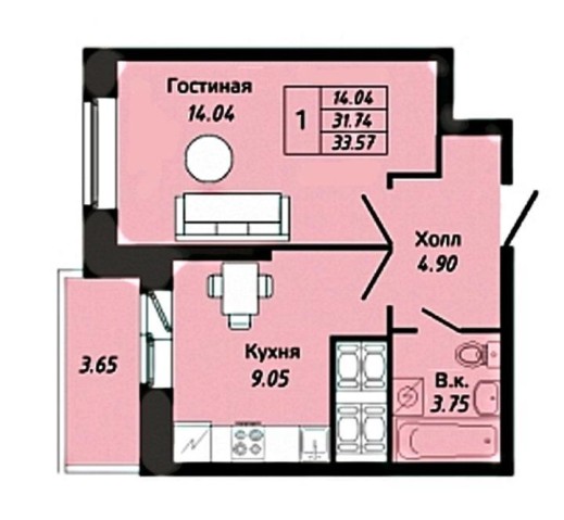Площадь квартиры составляет 35,4 кв. метра, из которых 21 квадратный метр занимает комната.